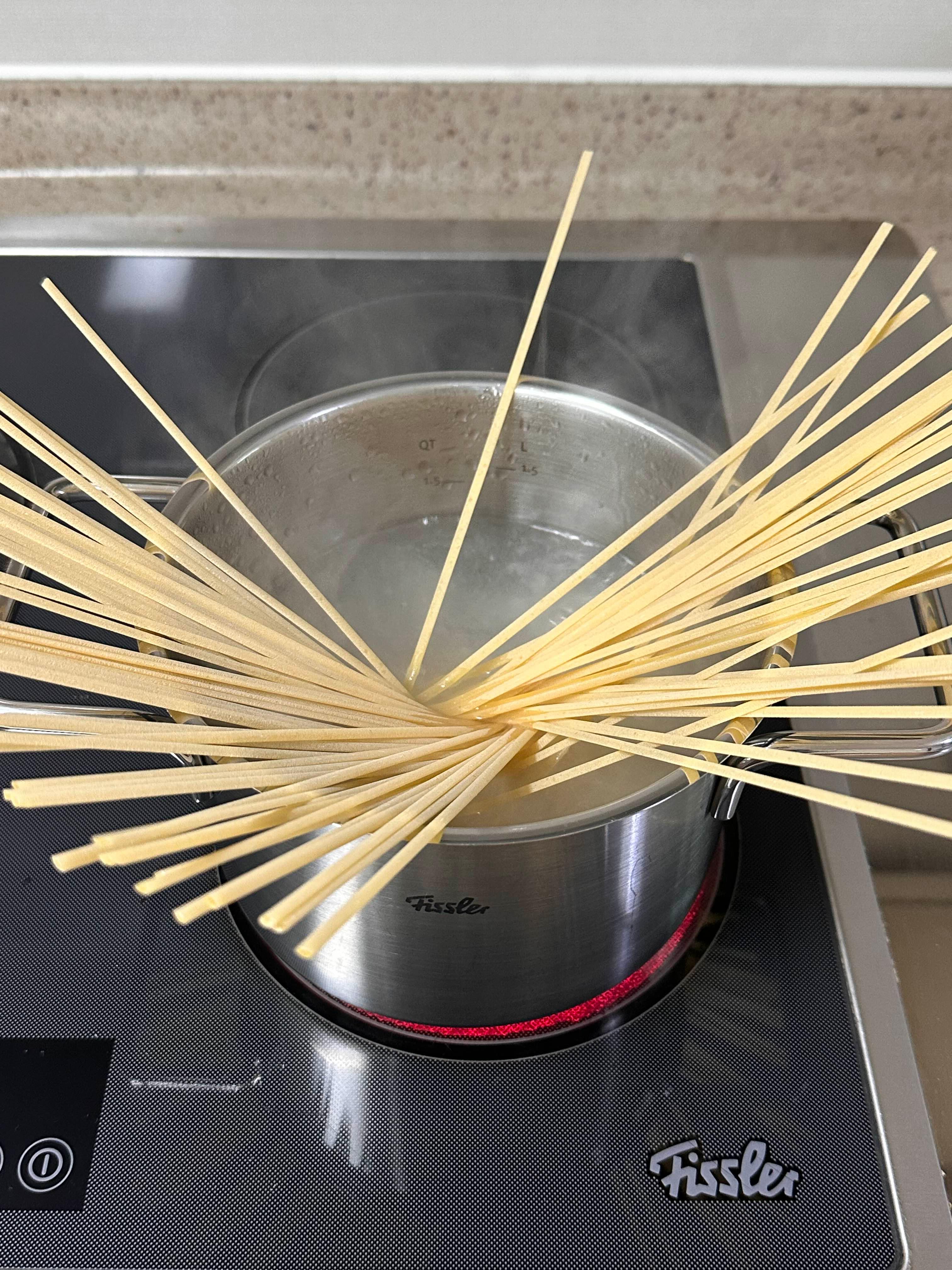 물이 끓기 시작하면 파스타 면을 넣고, 소금 1작은술도 함께 넣어주세요.