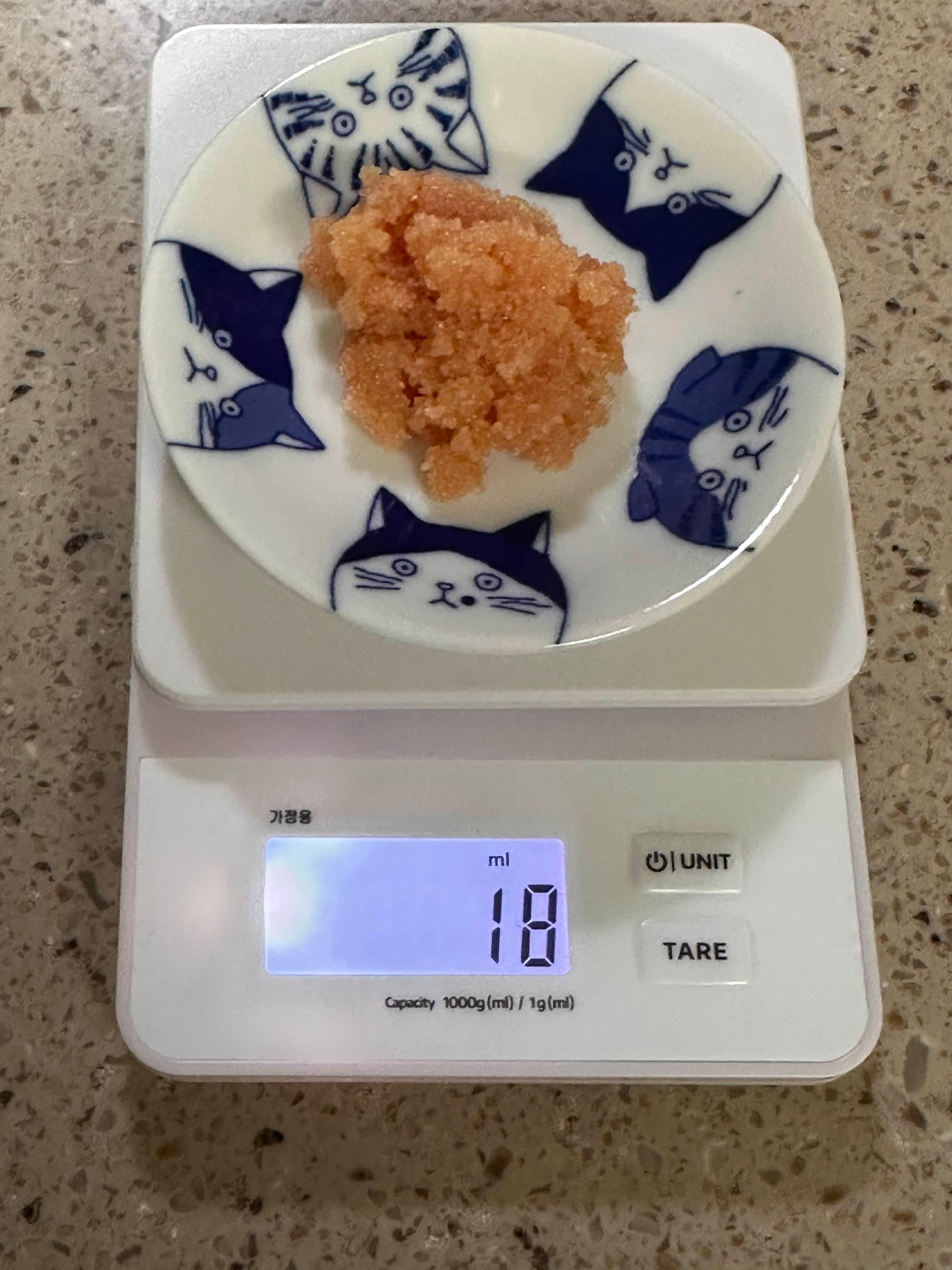참고로 명란 1큰술을 저울로 재보니 약 18g 정도 나왔어요!