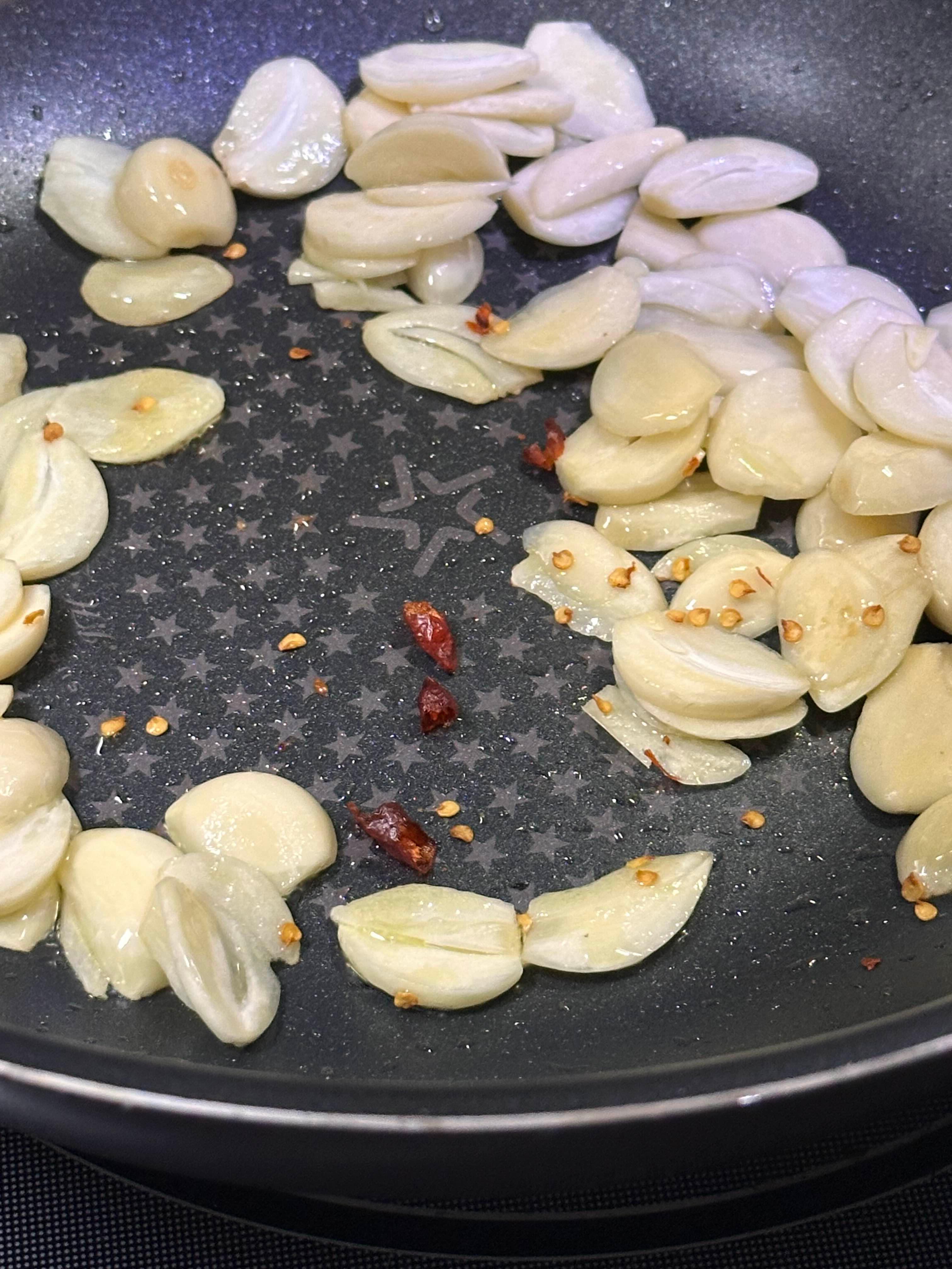 마늘이 살짝 노릇해지기 시작하면, 페퍼론치노 3개를 잘게 부숴 함께 넣어 매콤한 향을 더해줍니다.