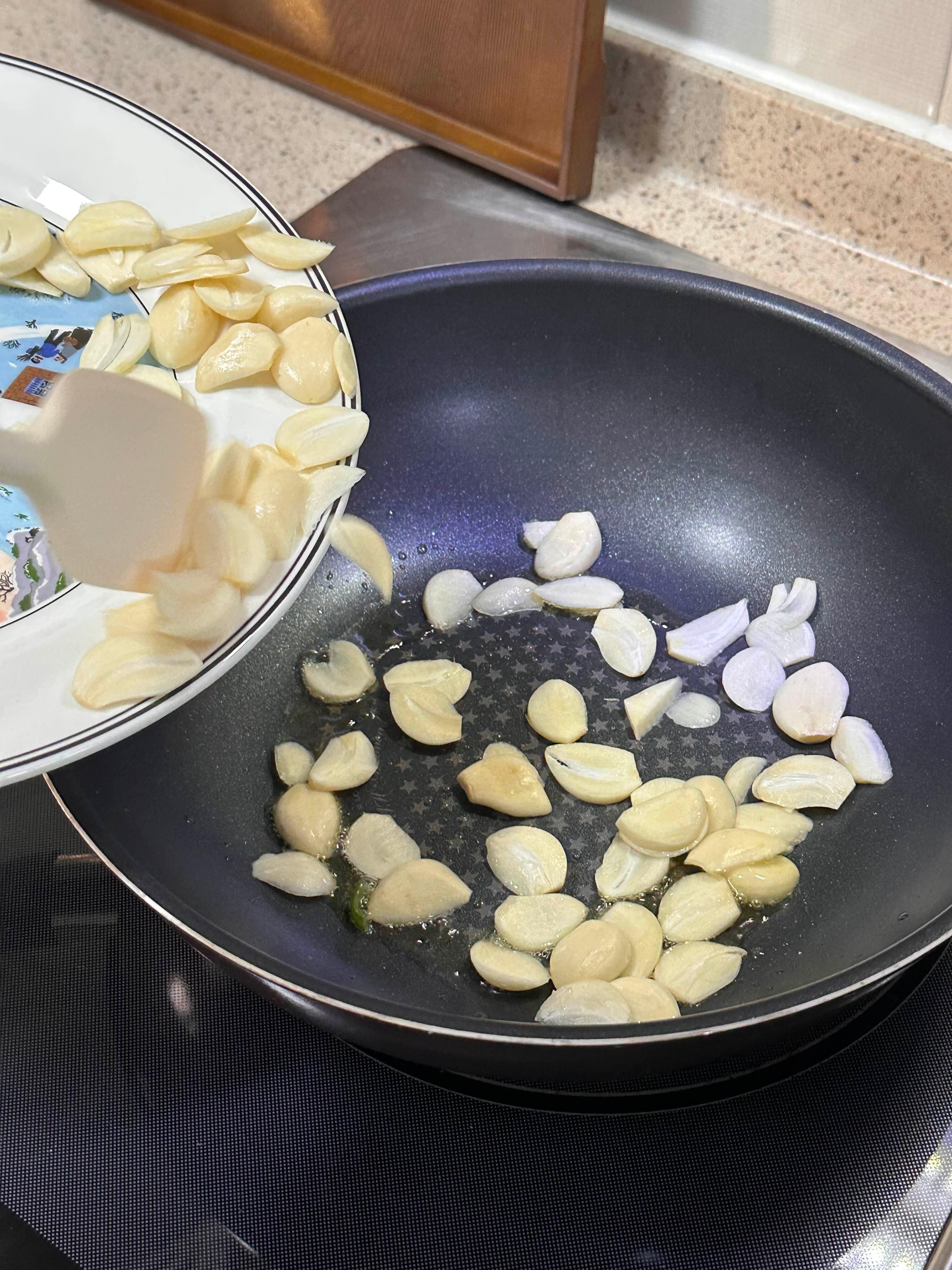 예열된 팬은 중강불로 낮춘 뒤, 썰어둔 마늘을 넣고 볶아주세요.