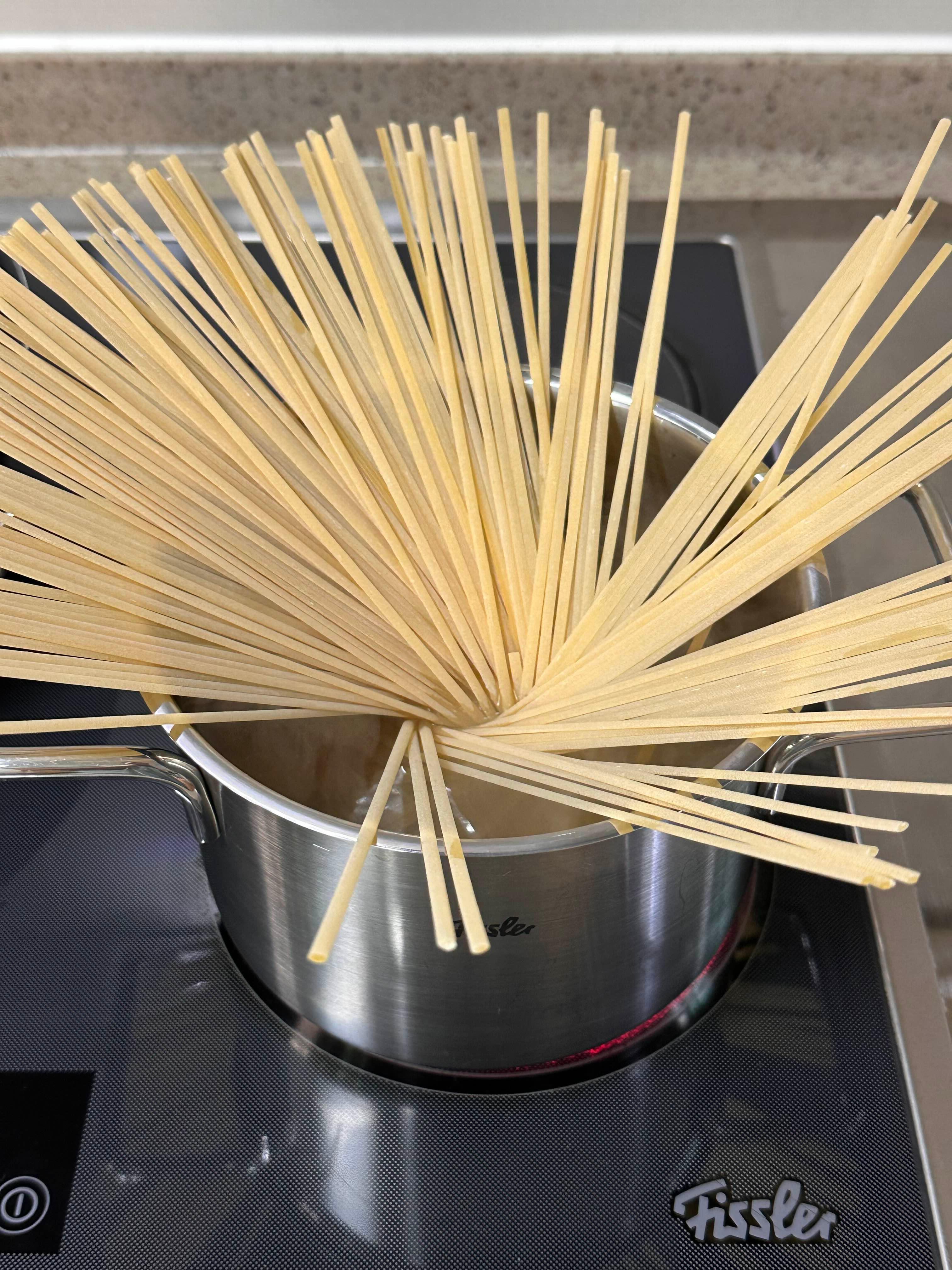 파스타면 200g을 끓는 물에 넣고 10분~12분 삶아주세요.