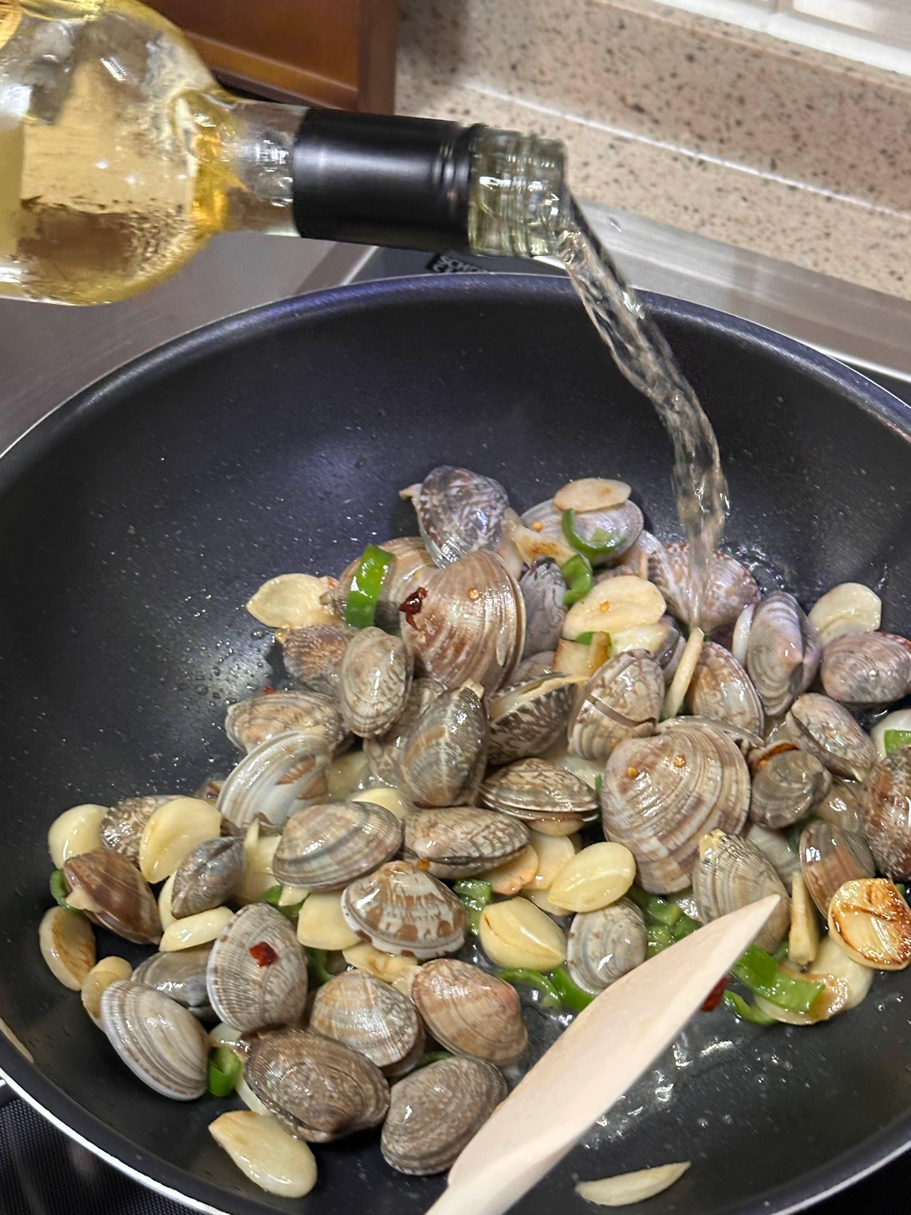페퍼론치노를 넣고 약 1분간 볶아 향을 낸 뒤, 해감한 바지락을 넣어주세요.