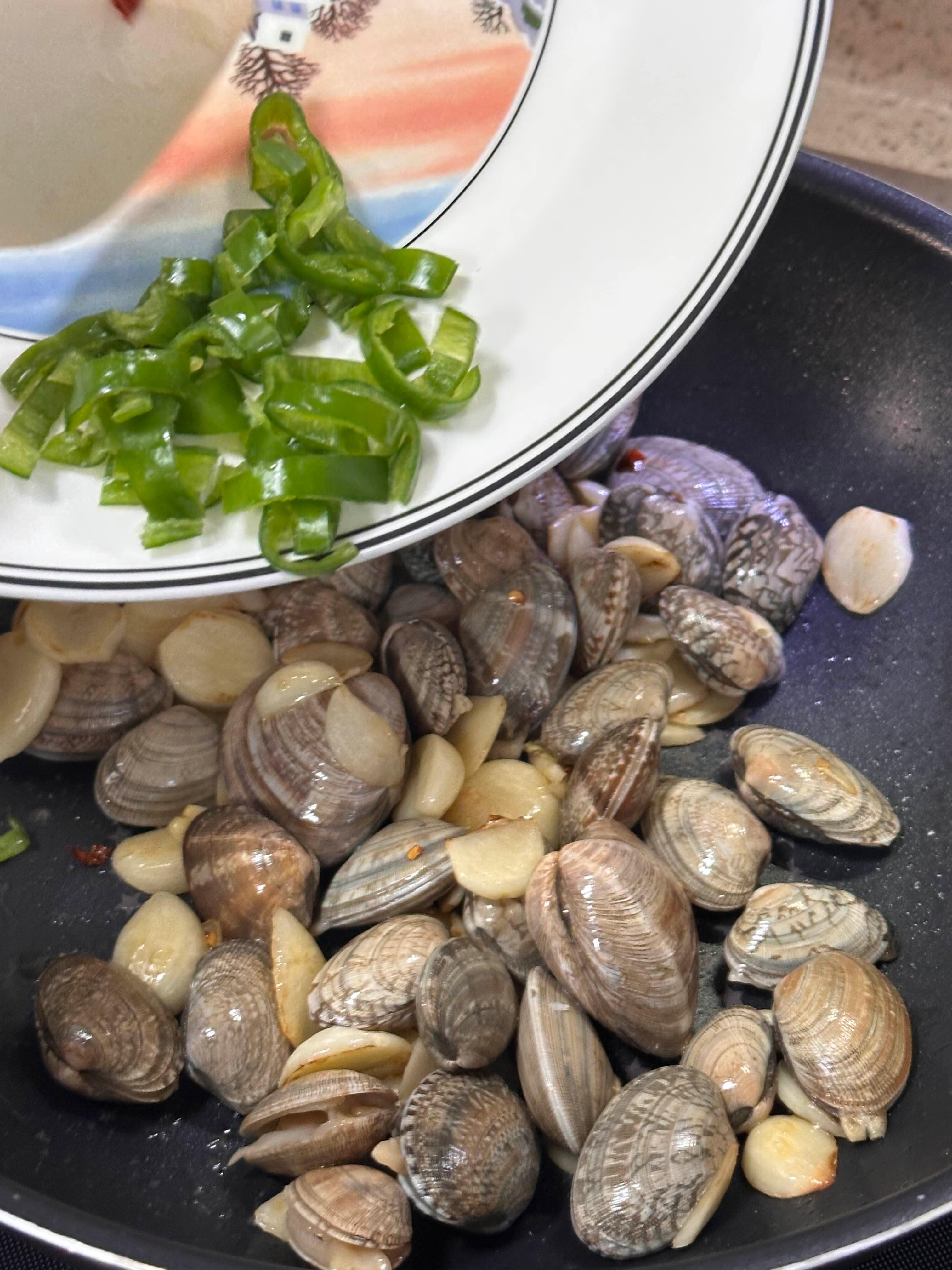 중강불에서 약 2분간 바지락을 볶아주고, 썰어둔 청양고추도 함께 넣어 매콤한 맛을 더해줍니다.