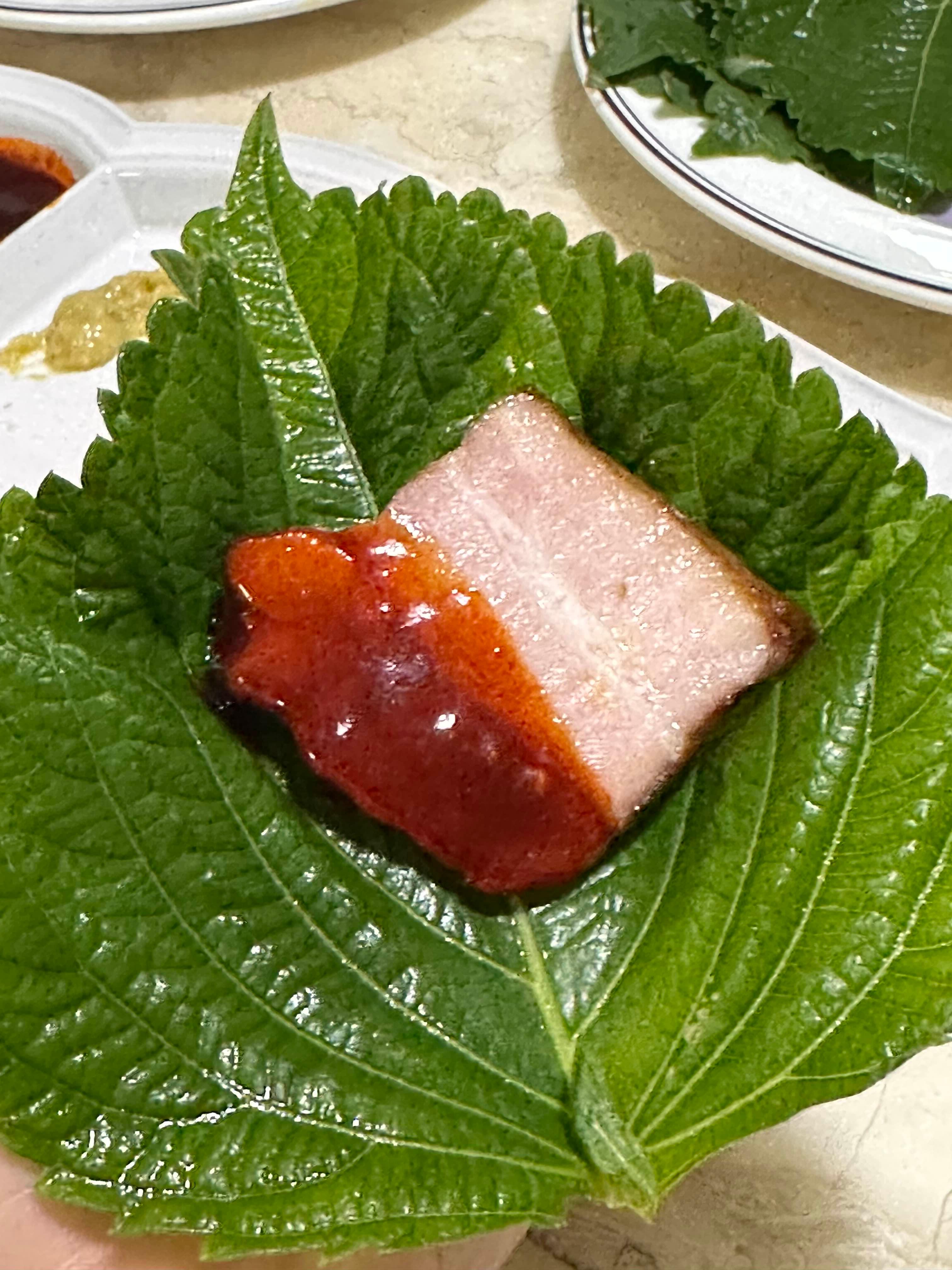 입안 가득 향긋한 깻잎의 맛과 와사비의 알싸한 매콤함, 쌈장의 감칠맛이 조화롭게 어우러졌습니다.
