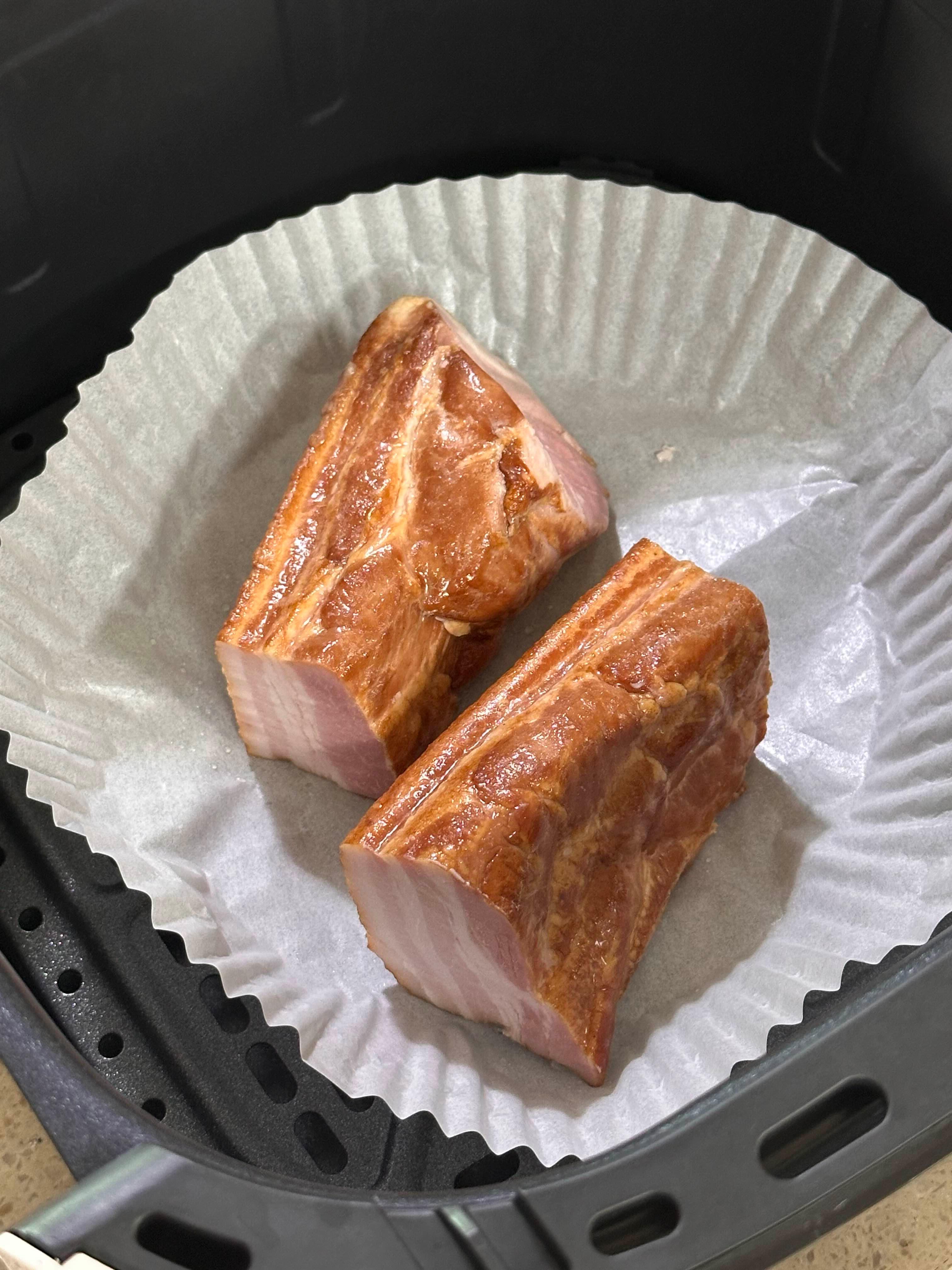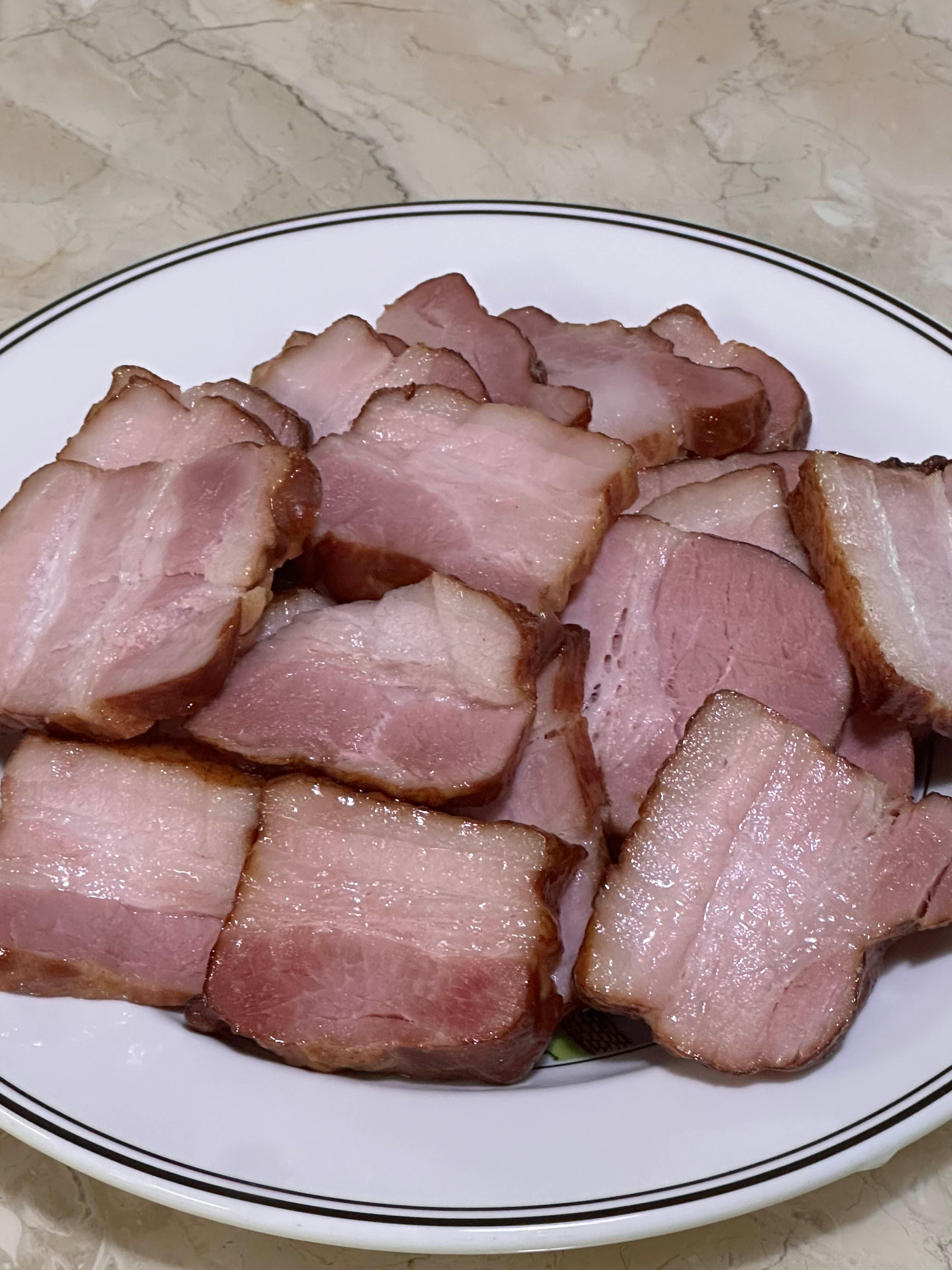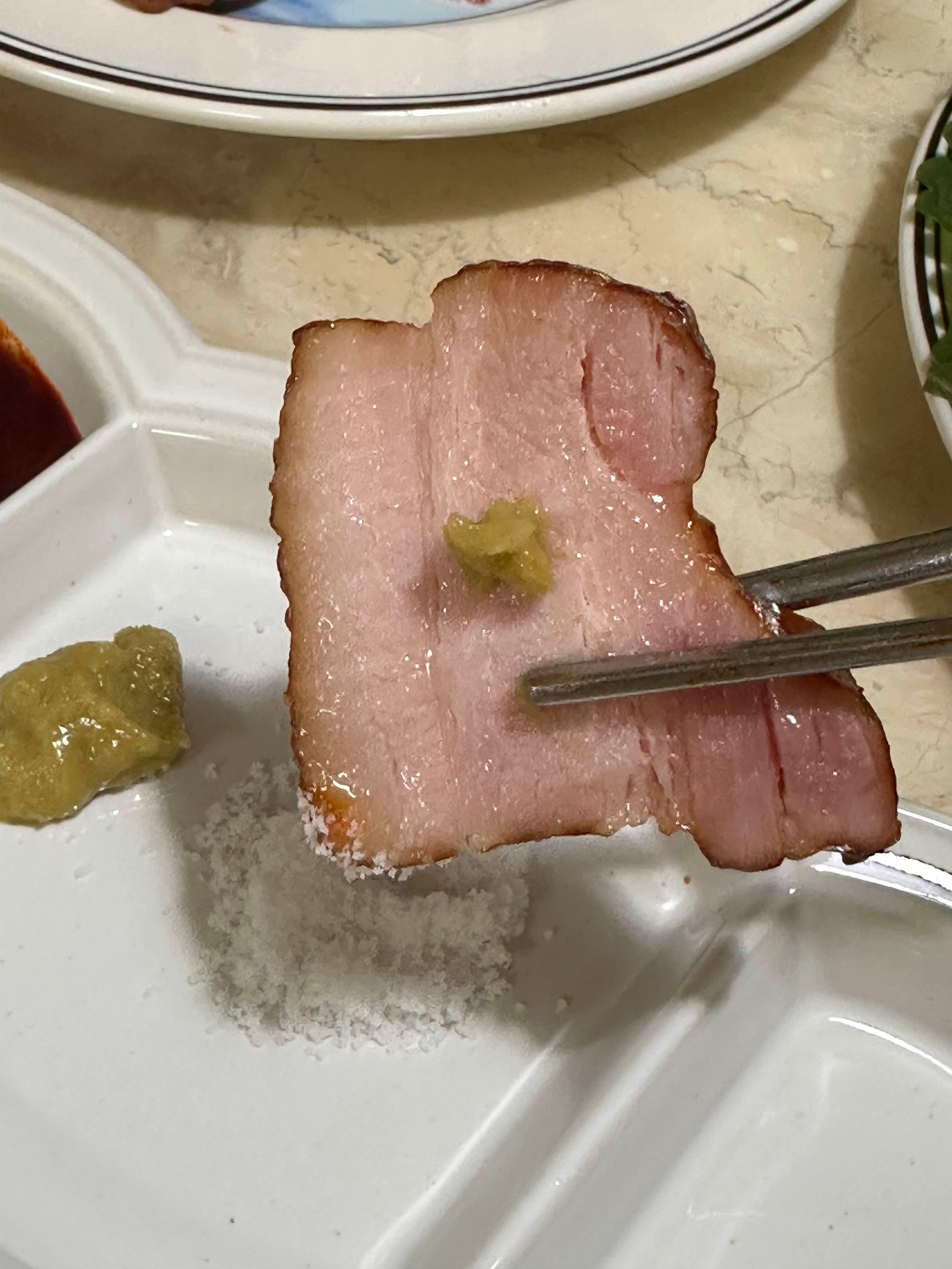 도톰하게 썬 훈제 삼겹살, 단면에서 촉촉한 육즙이 반짝이네요.