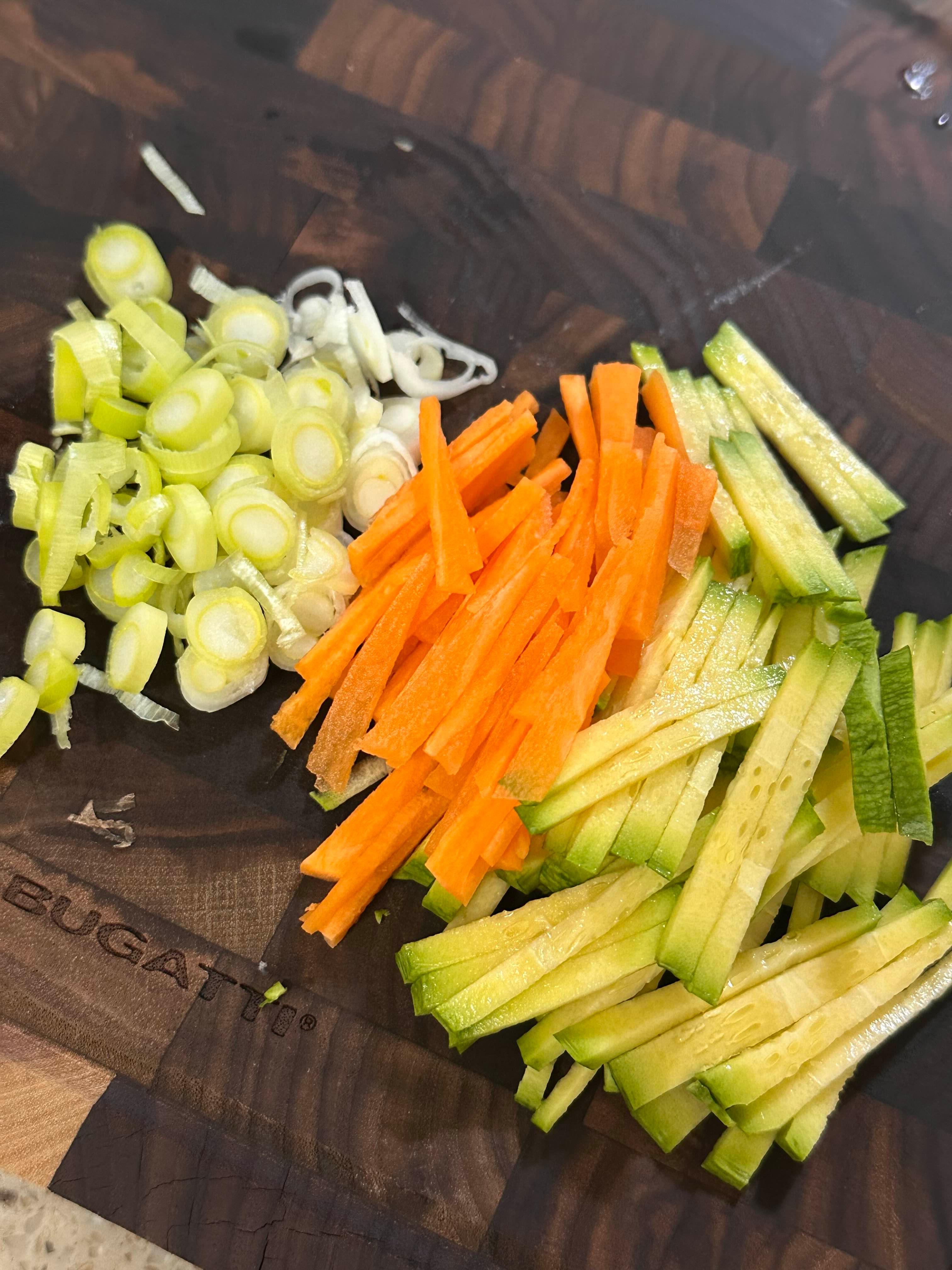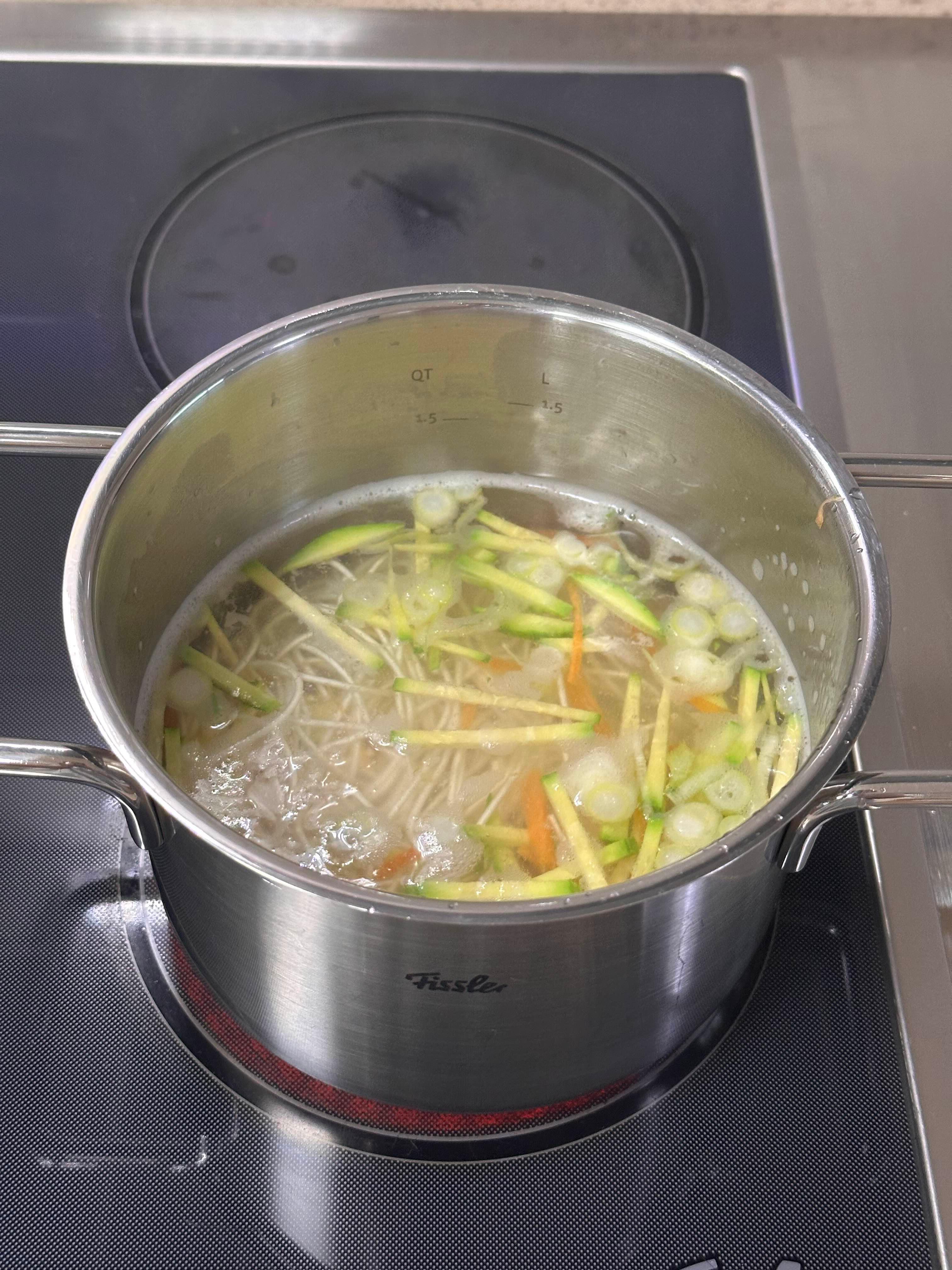 손질해 둔 애호박과 당근, 그리고 대파 절반을 넣어 약 3분 동안 다시 끓여주세요.