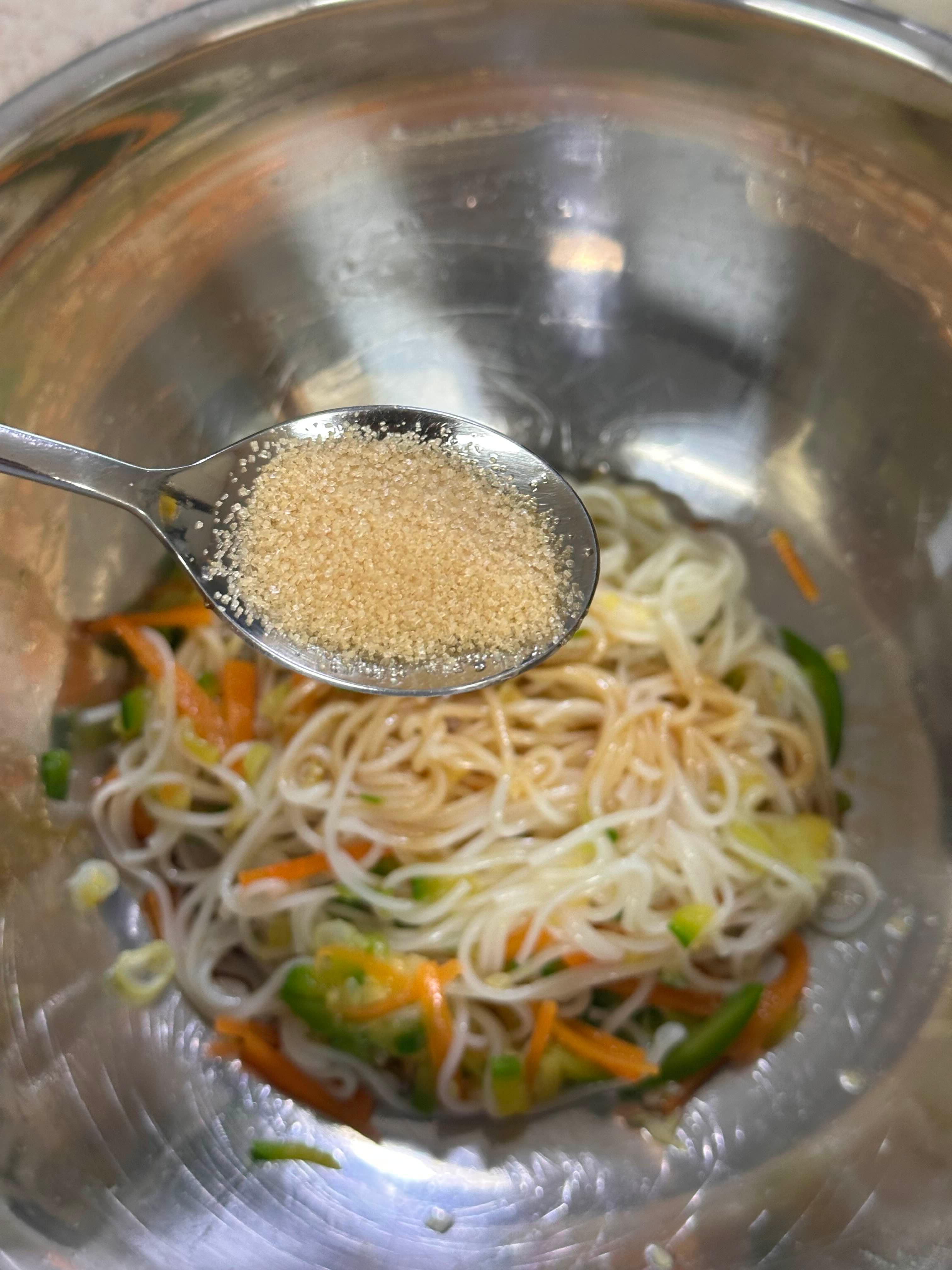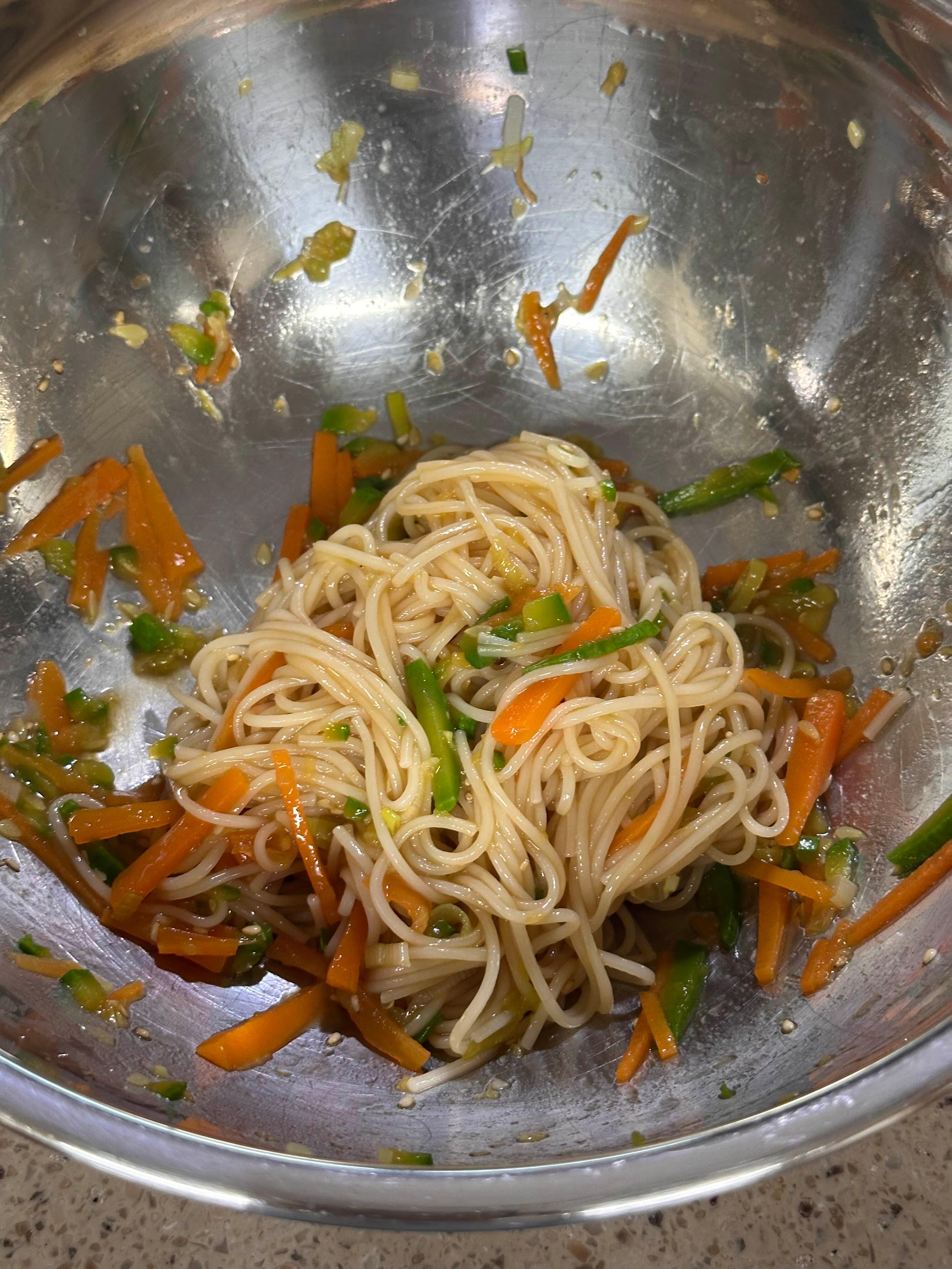 삶은 면과 야채는 채반에 받쳐 찬물에 여러 번 헹궈 열기를 빼주세요.