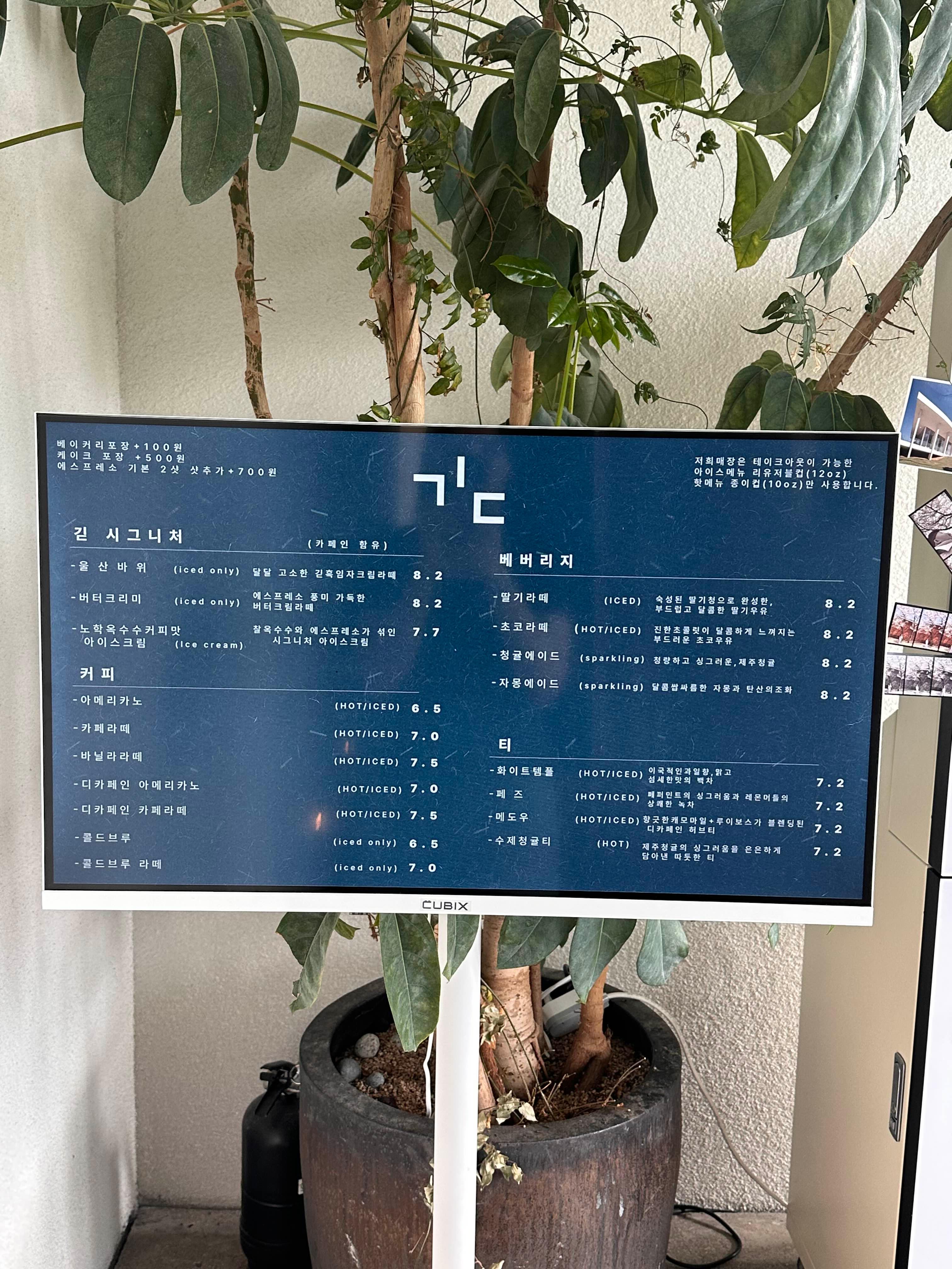 입구로 들어가자마자 보이는 카페 긷의 메뉴판!
