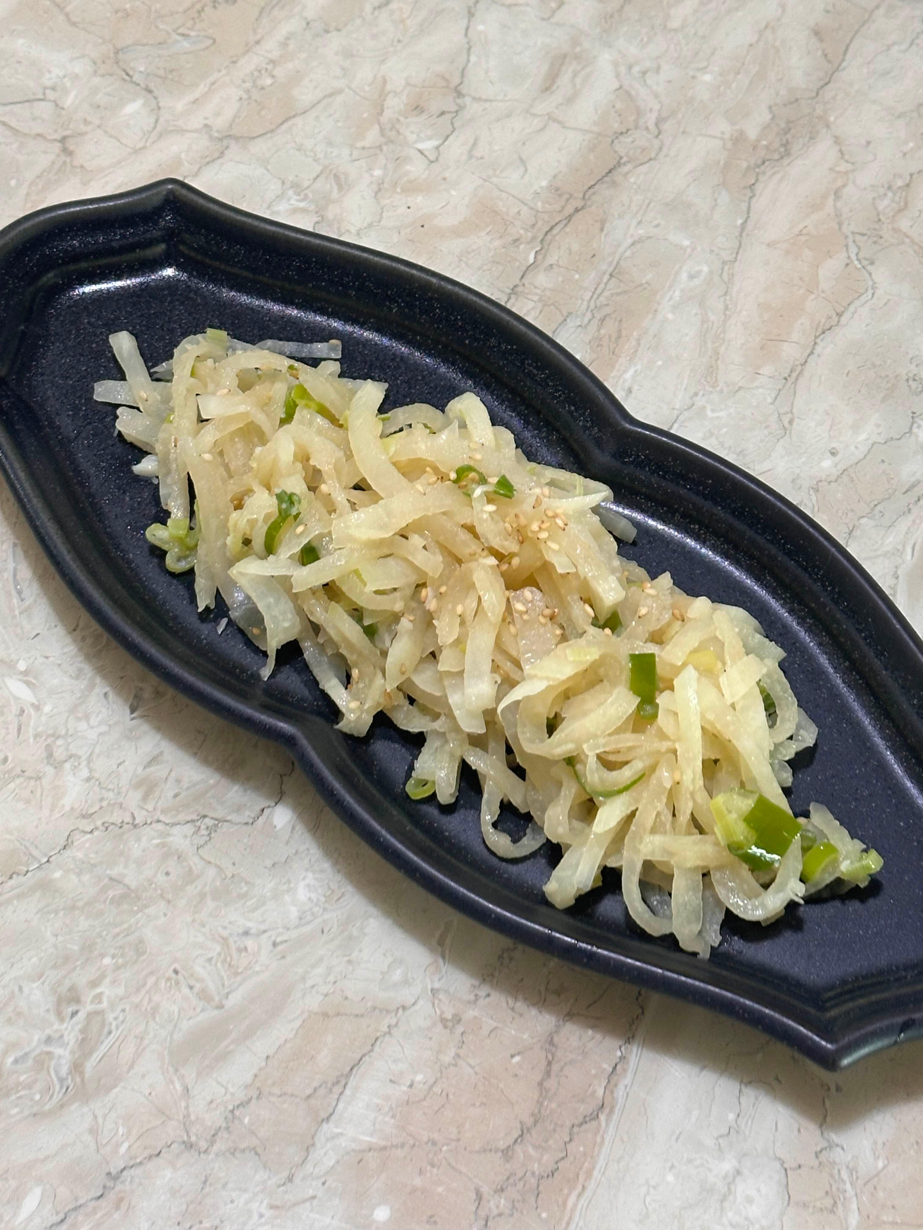 무는 얇게 채 썰고, 파는 송송 썰어주세요.