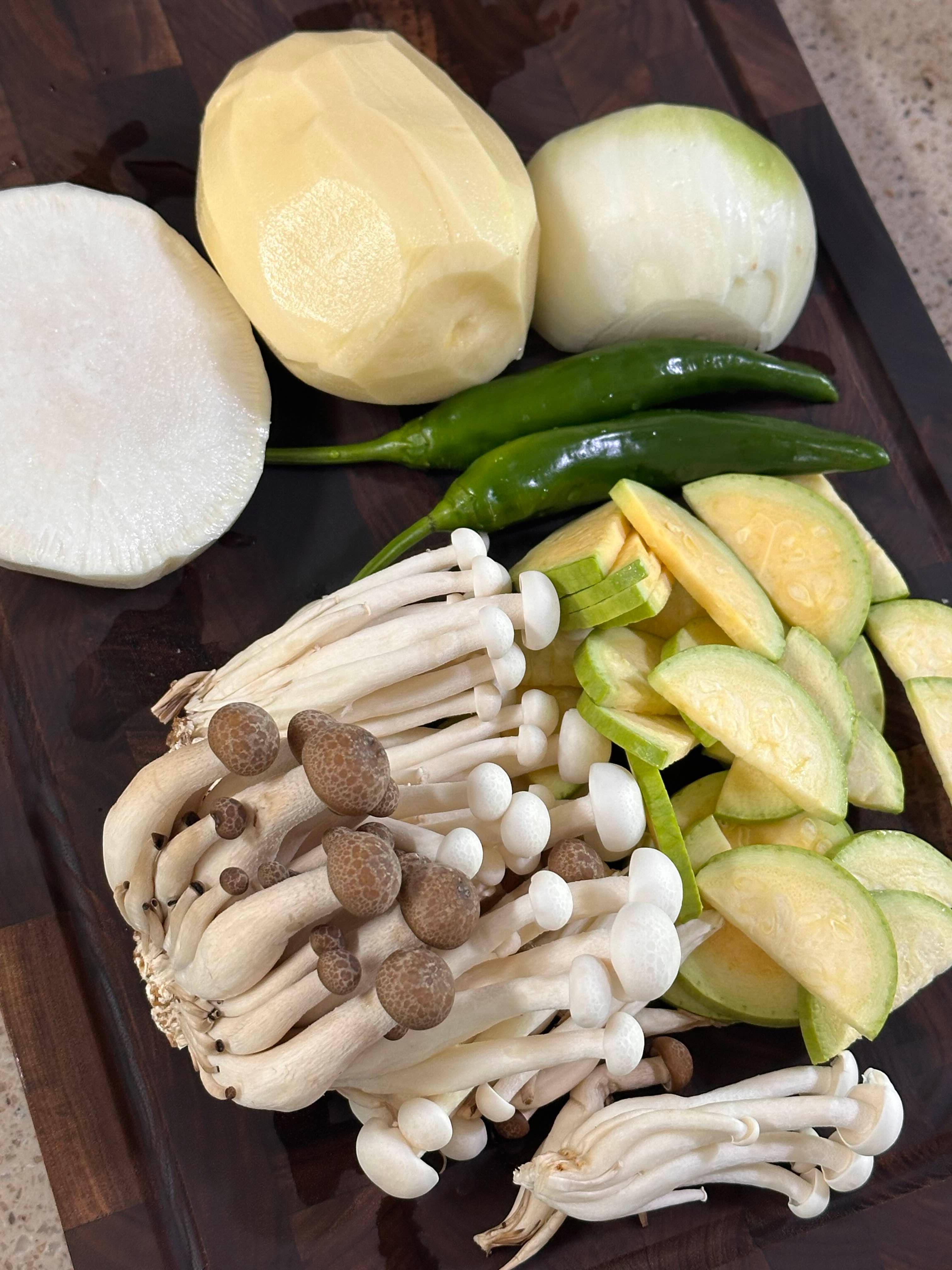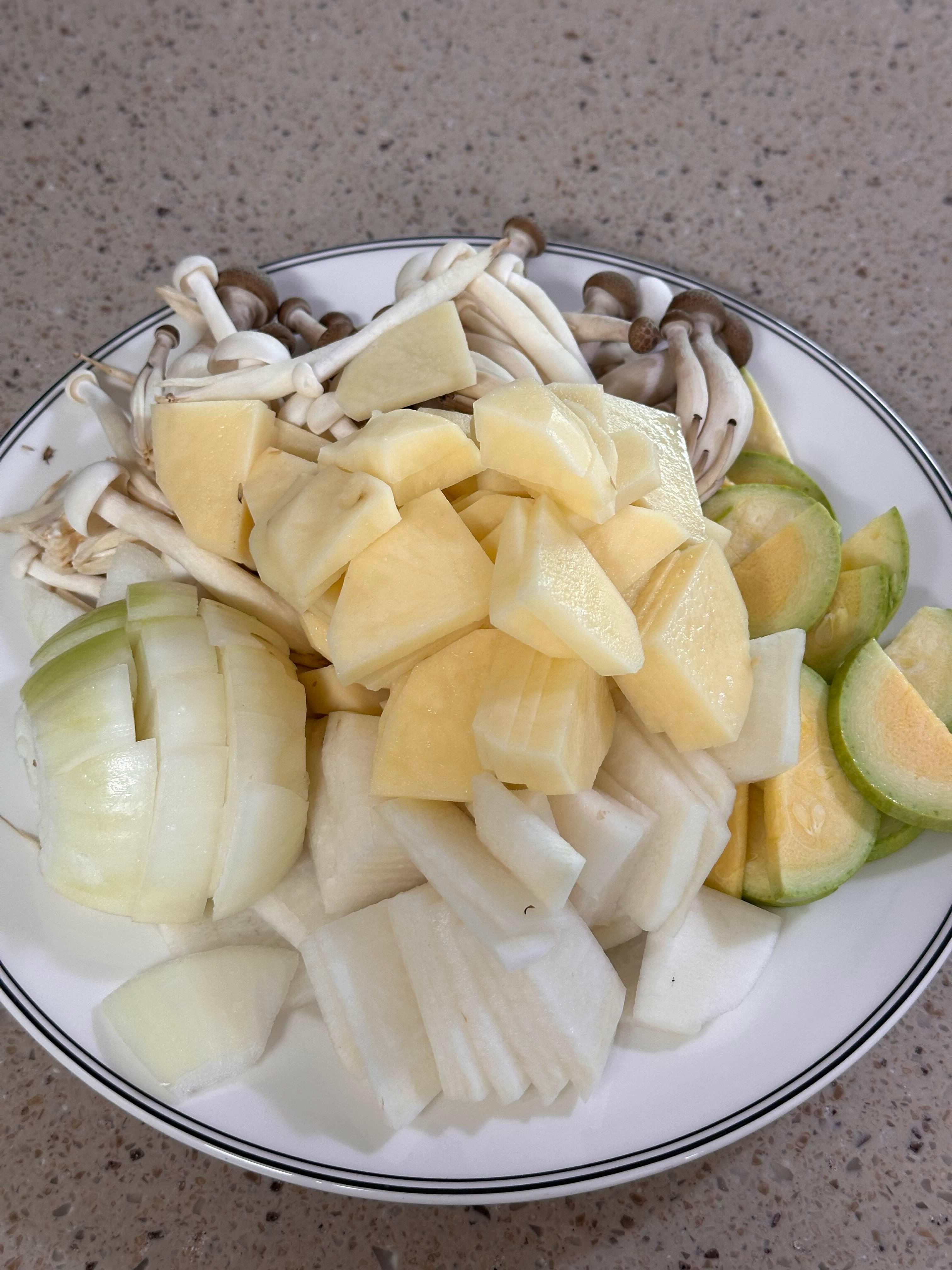 애호박, 감자, 무는 너무 얇지 않게 나박 썰기 해주고,