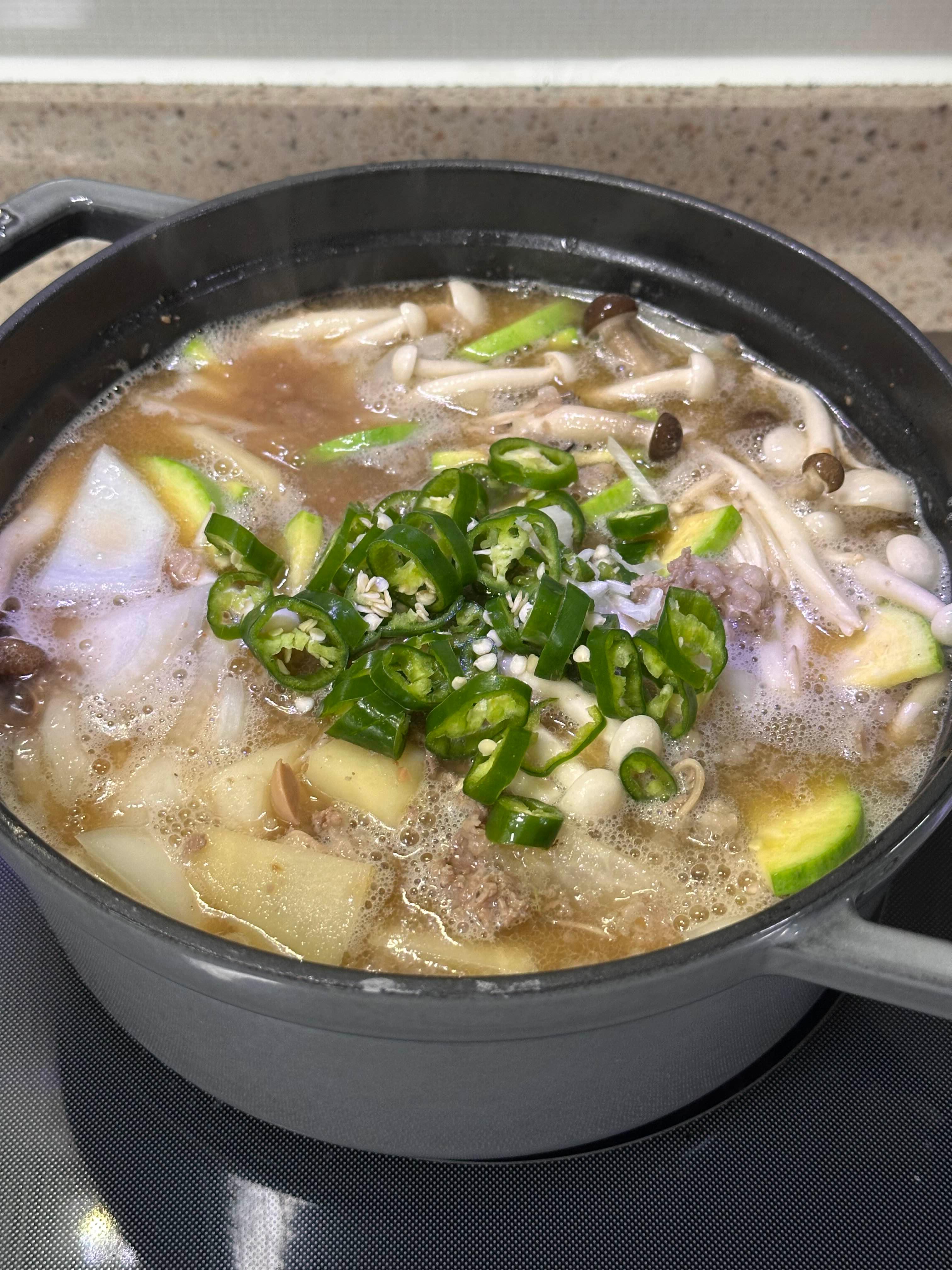 버섯, 양파, 애호박, 청양고추를 넣고 3분간 끓여줍니다.