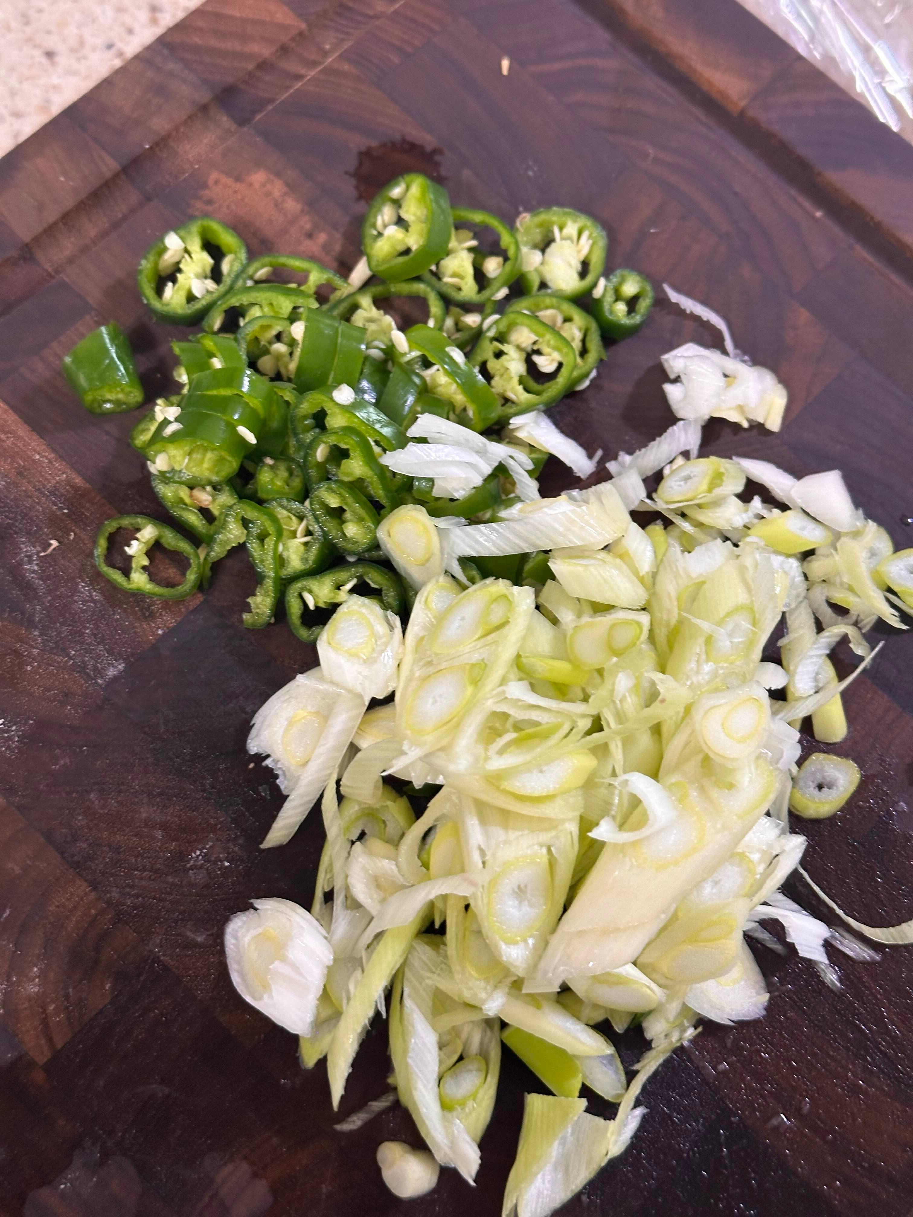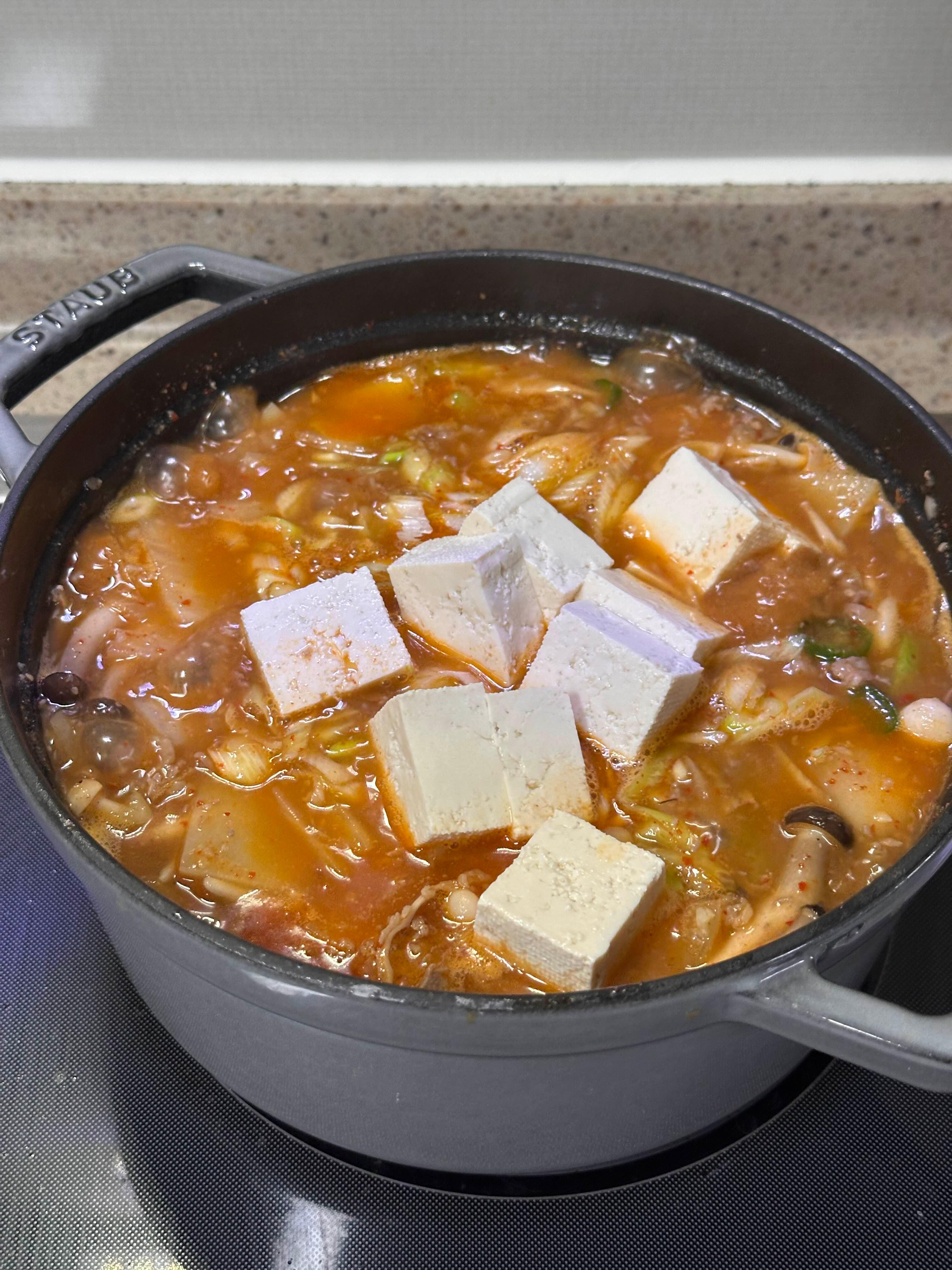 고춧가루 1T를 넣고 잘 저어준 뒤, 파와 두부를 넣어 강불에서 5분간 더 끓여줍니다.