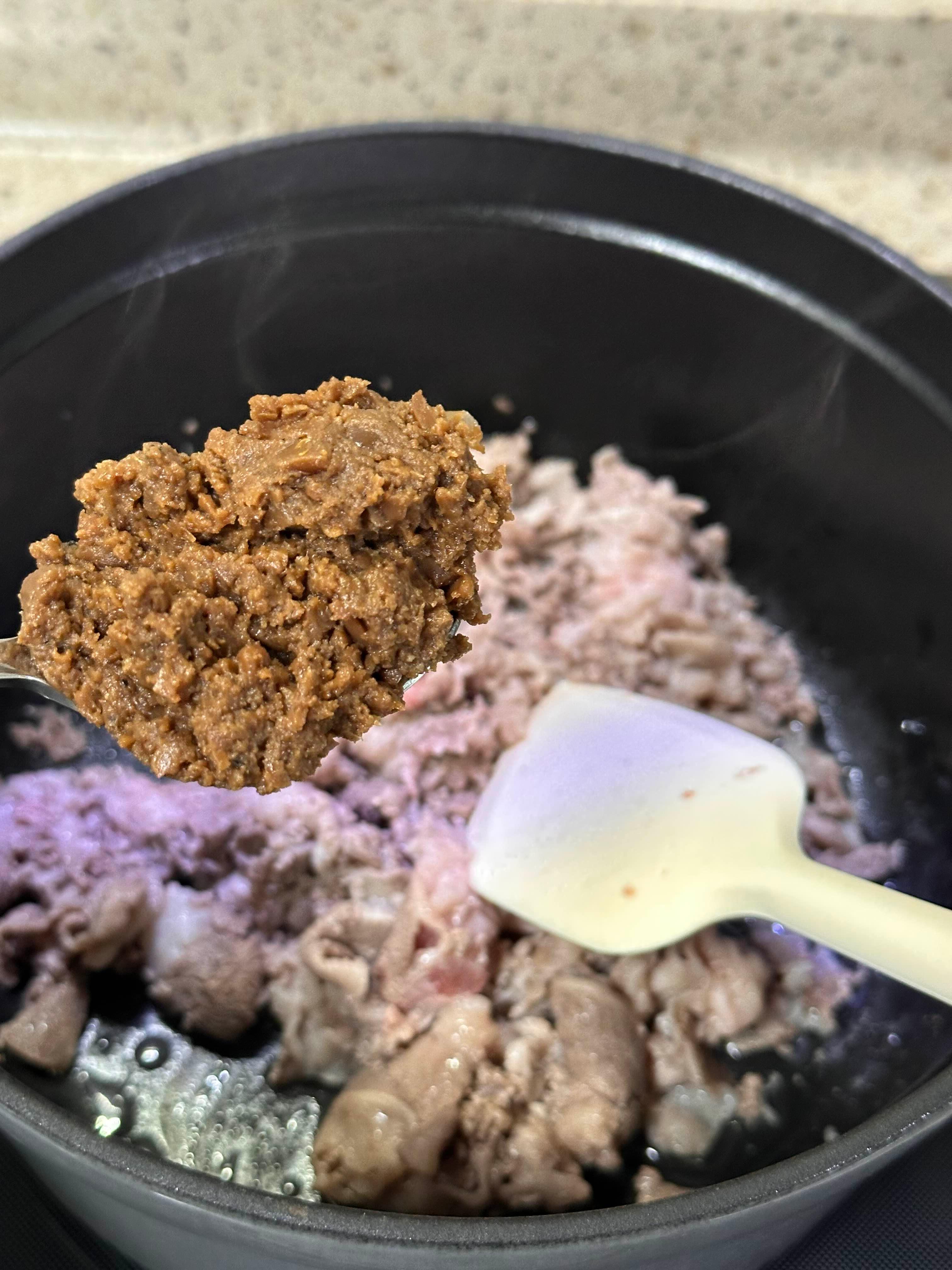 된장 2.5T를 넣고 중강불에서 3분 정도 함께 볶아줍니다.