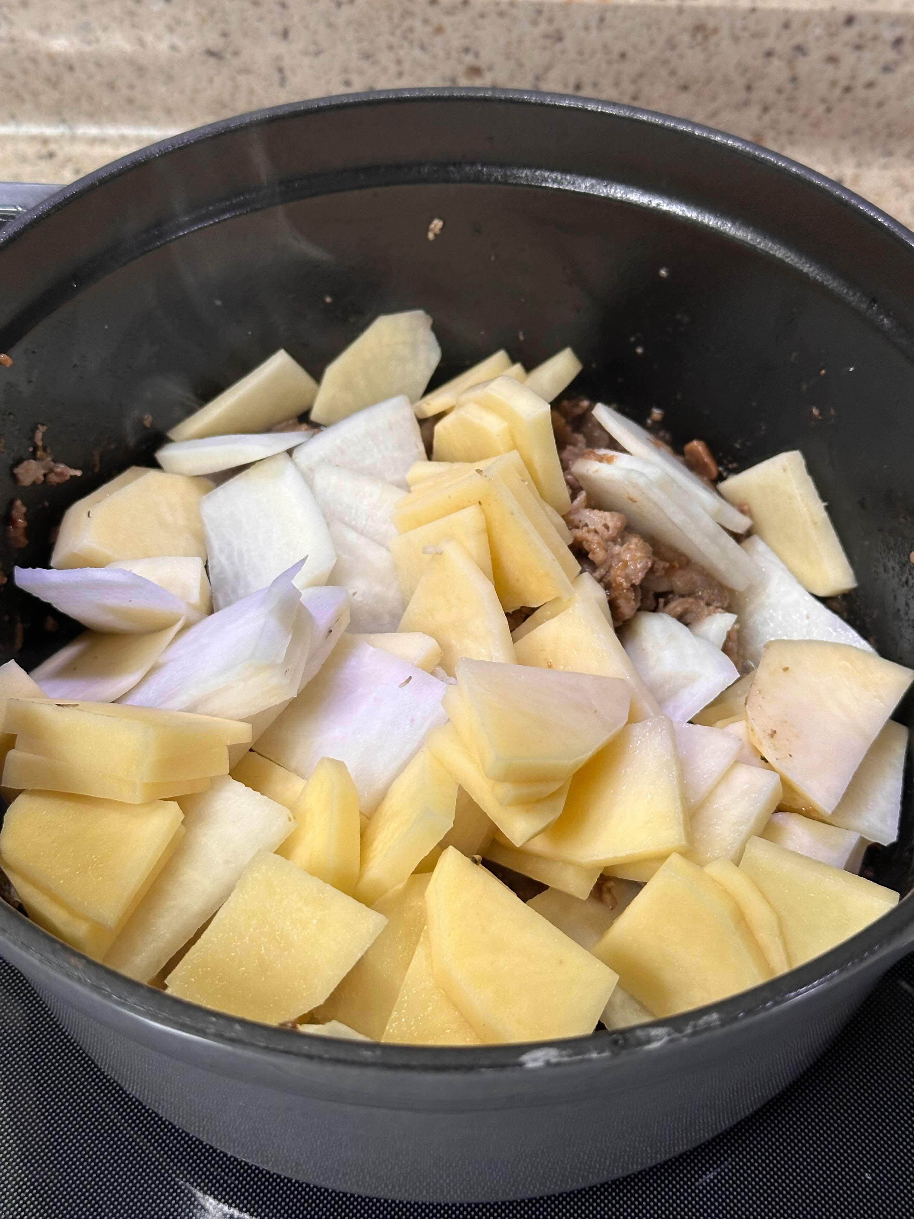 썰어놓은 감자와 무를 넣고 중강불에서 5분 동안 다시 볶아주세요.