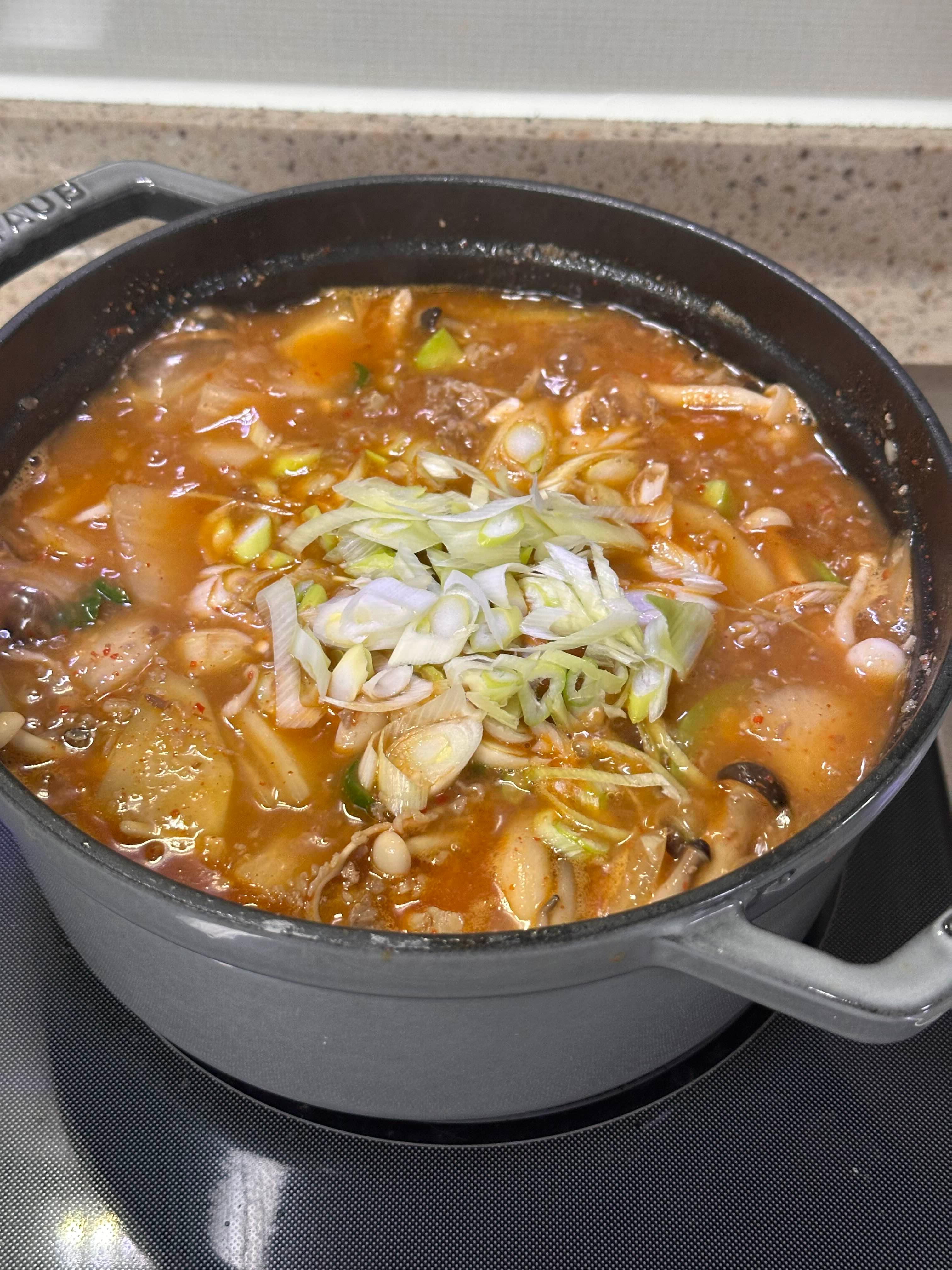 만약 우삼겹에 기름이 많아 찌개 위에 기름이 지나치게 뜨면, 국자로 살짝 걷어내 주세요.