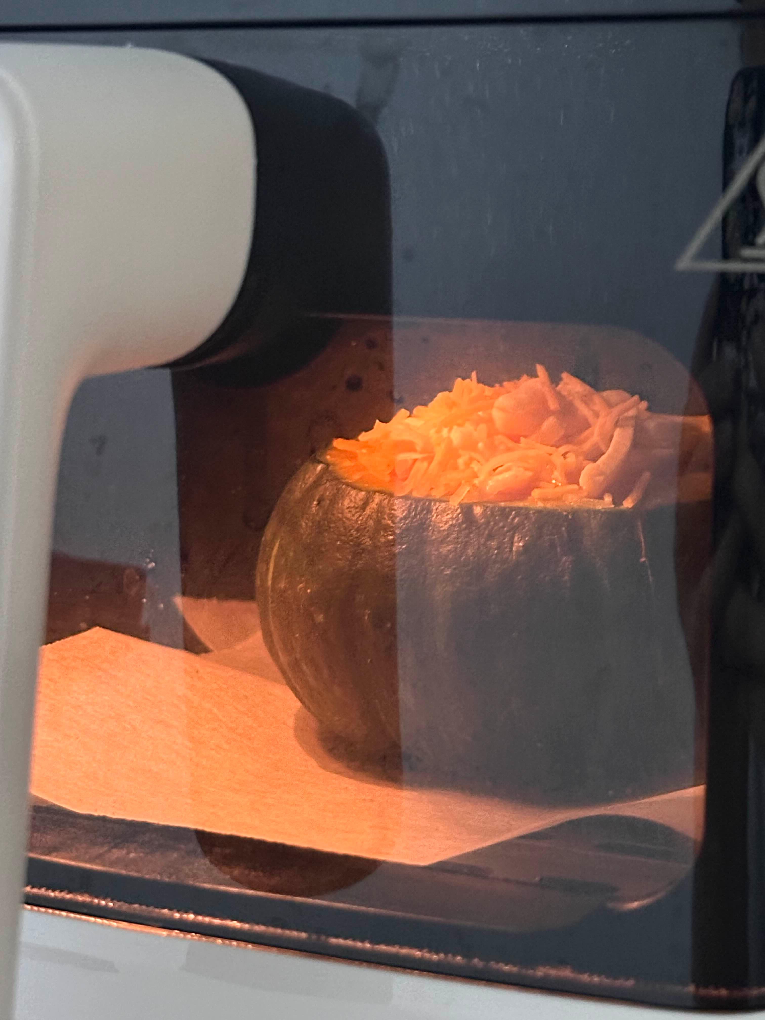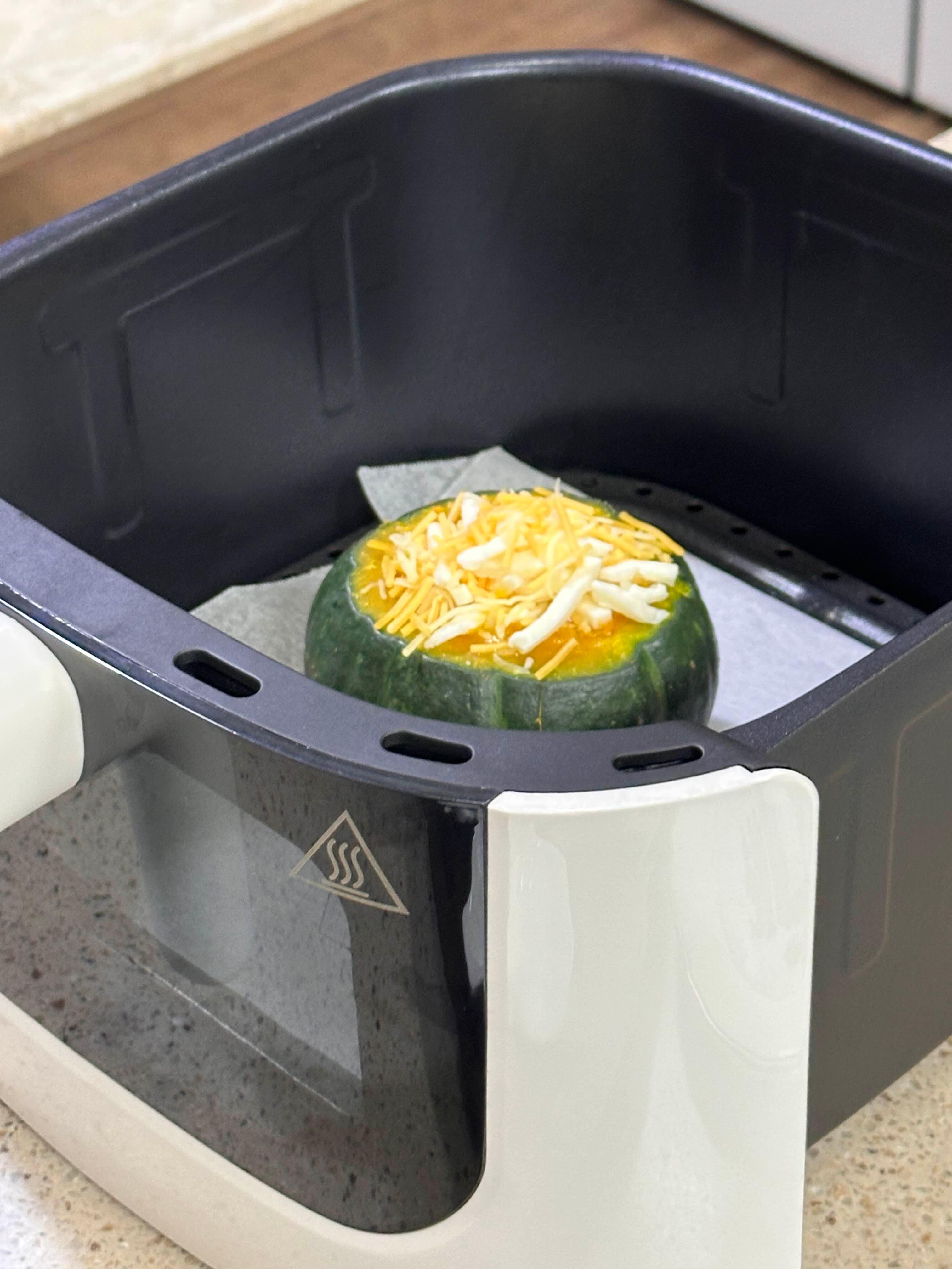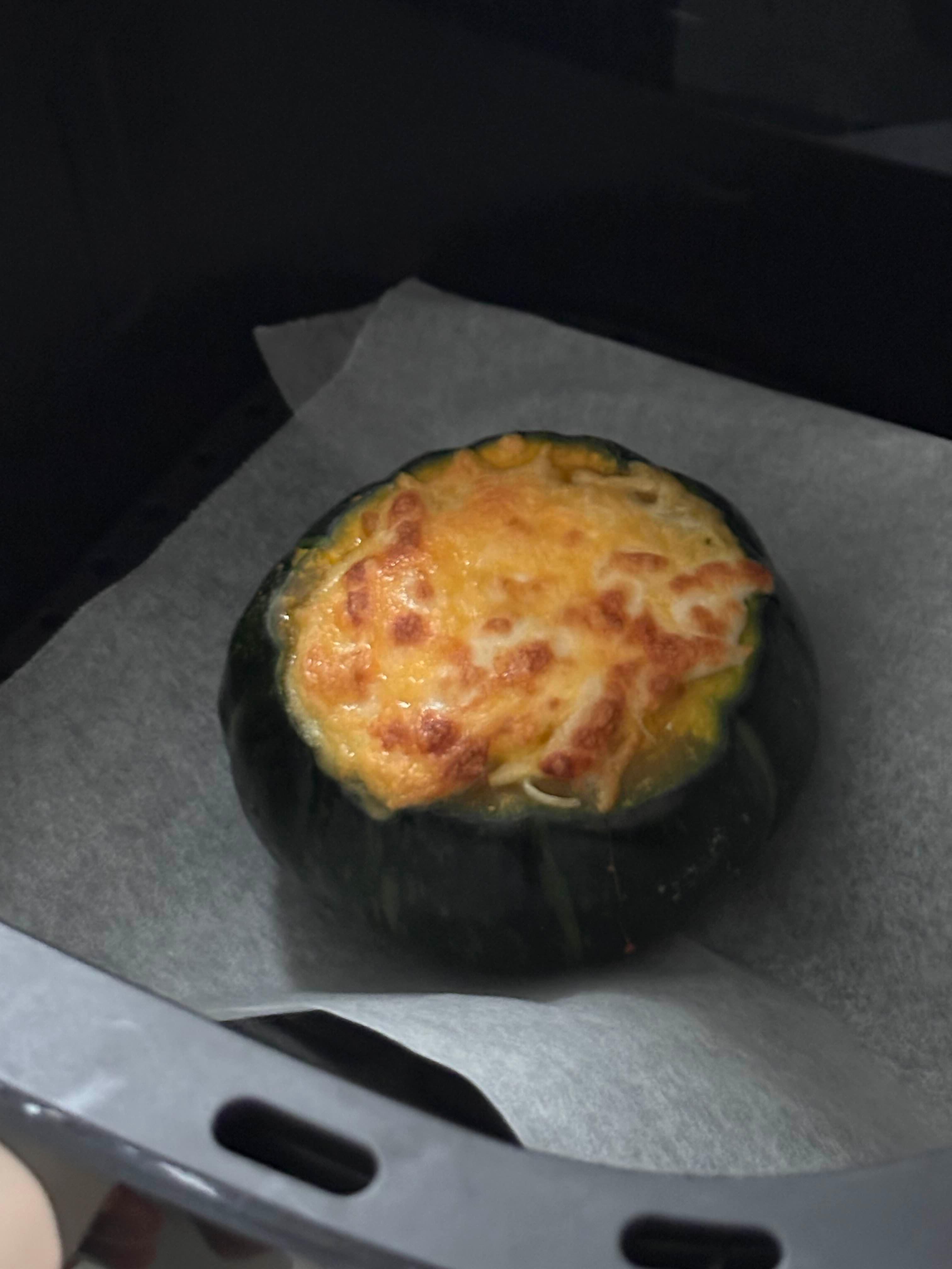 이제 단호박을 전자레인지에서 꺼내 에어프라이어에 옮겨 담아주세요.